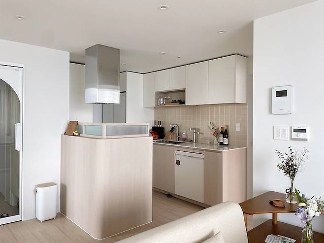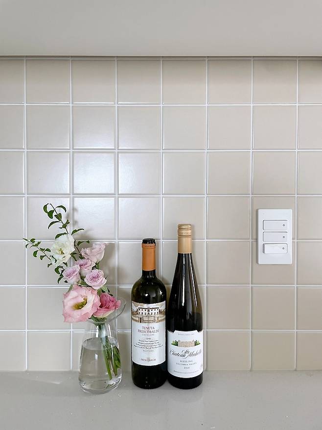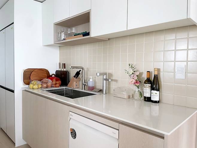 주방 타일 색에 대해서 고민이 많았는데 완성된 모습을 보니 베이지 톤으로 맞추길 잘했다 싶었어요. 그로 인해 더 온기가 감도는 주방이 되었으니까요.