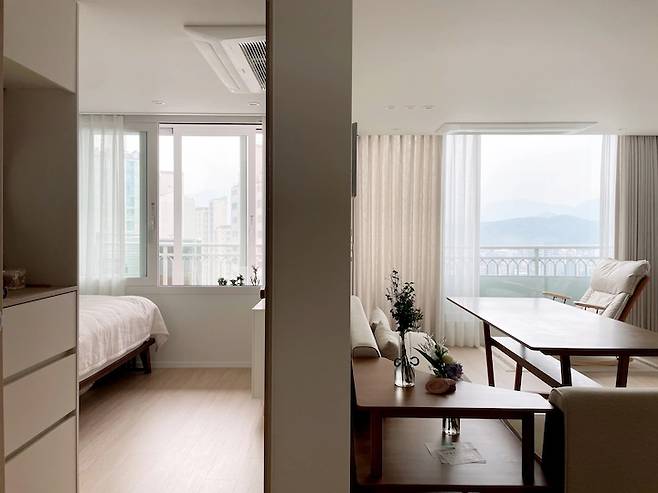 창문 높이가 침대와 딱 맞아서 안정적으로 느껴지고 침실과 베란다가 잘 분리된 느낌이라 침대에 있으면 폭 감싸진 느낌이 든답니다!