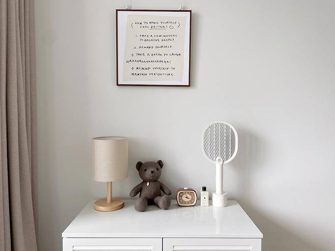 침대에 누워 맞은편을 바라보면 이런 모습입니다. 레일 액자걸이를 설치해 포인트가 되는 귀여운 액자를 걸어뒀고 아래로는 침실에 어울리는 몇 가지 소품을 놓아두었는데 아침에 일어나 제일 먼저 보는 모습이 이렇다니 꽤 행복해요 ;D