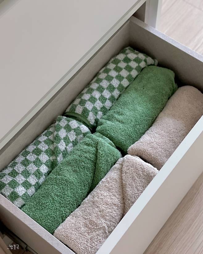 화장대 위아래는 수납공간으로 맨 아랫칸은 수건을 보관하고 있어요. 화장실에서 씻고 나와 수건이 없어도 발매트에 서서 손만 뻗으면 되는 거리라 아주 편리하답니다!