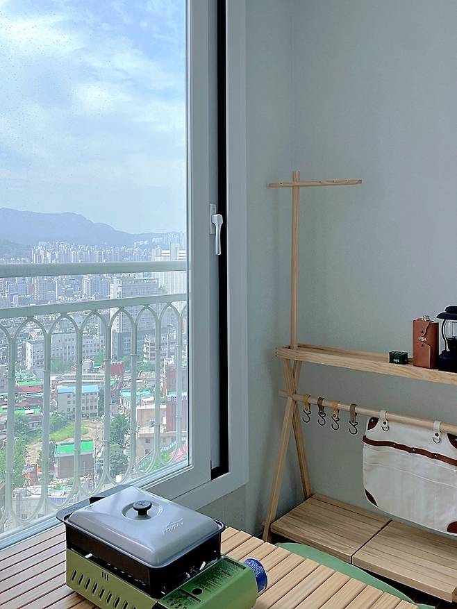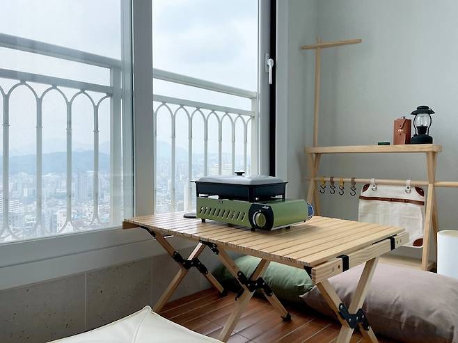 베란다는 캠핑 느낌으로 꾸며 술 한 잔 하기 좋은 공간으로 만들었어요. 둘 다 술을 좋아하는지라 도란도란 이야기 나누며 바람도 쐬고 맛있는 음식과 술로 힐링하는 공간입니다.