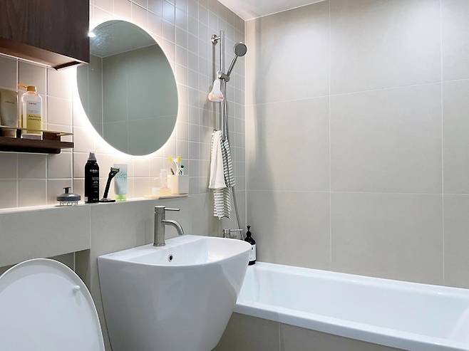 문을 열고 들어서면 깔끔하고 아기자기한 욕실을 만날 수 있어요. 제가 목욕을 매우 좋아하기 때문에 욕조는 무조건 있어야 한다고 했어요. 하지만 요즘 유행하는 조적 욕조는 왠지 따스한 감성이 없어서 딱 잘라 싫다고 거절했죠.