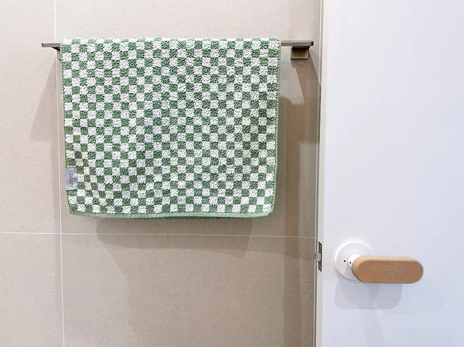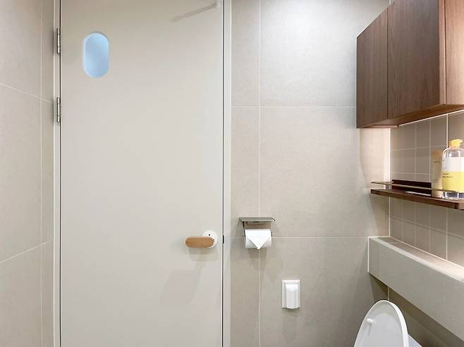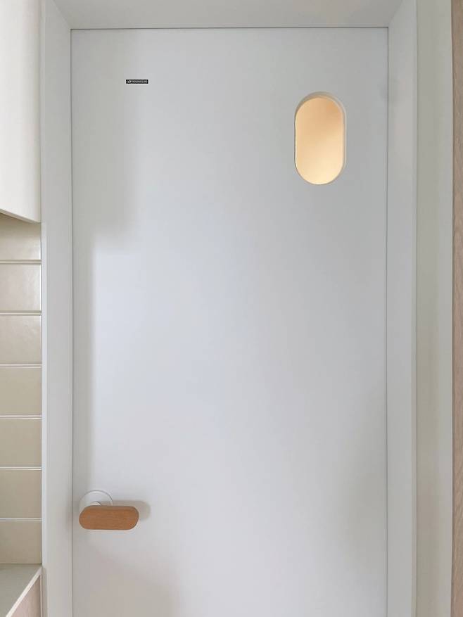 저희 집 욕실은 문 부터 귀여운 포인트가 2가지나 있어요. 동글동글 귀여운 우드 손잡이 안에 사람 있어요 표시해 주는 작은 반투명 유리가 그것이랍니다! 실제로 본 분들은 누가 골랐냐고 잘 골랐다고 칭찬 많이 해주셨답니다.