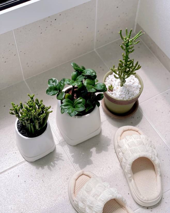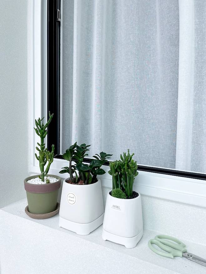 안방과 베란다 사이의 창문 크기를 원래 사이즈 보다 줄였기 때문에 단차가 생겼는데요. 이 공간은 반려식물 놓아두기 딱 좋은 공간이 되었답니다! 처음에 데려온 "몽당이" 다음으로 화분 선물을 두 번이나 더 받아서 친구들이 늘어났어요. 식물 키우기에는 소질이 없지만 선물인 만큼 최선을 다해 돌보고 있답니다.