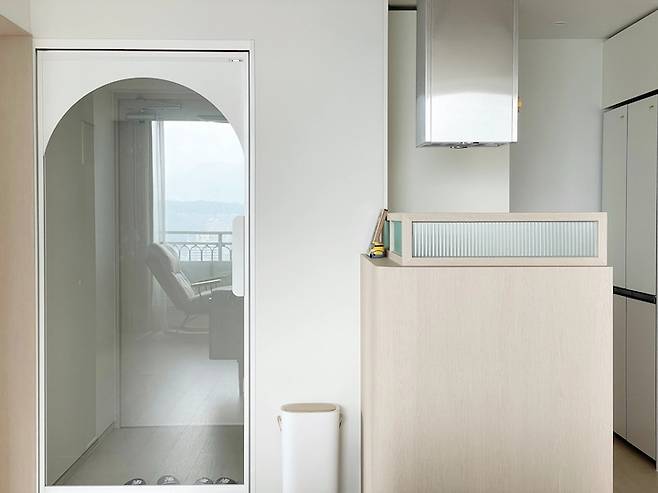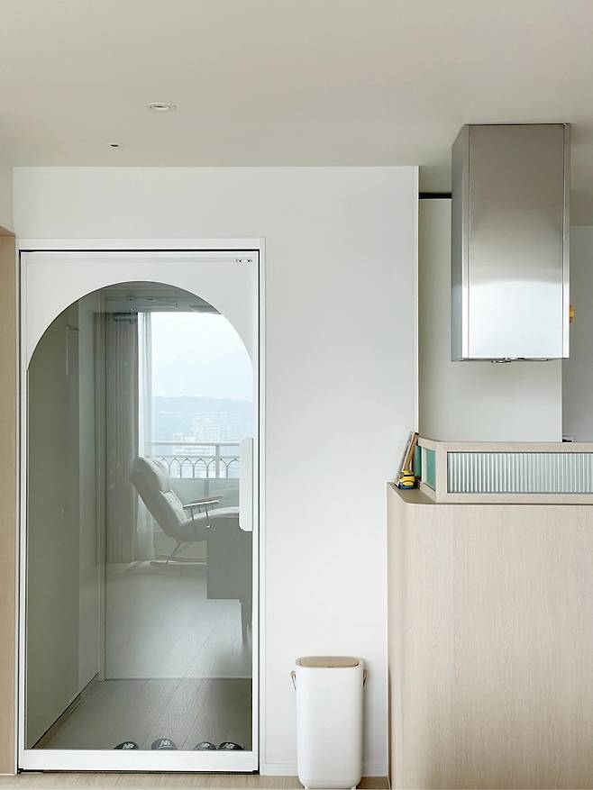 하지만 너무 답답하게 막아버리는 것은 싫었고 3연동 중문은 이전 집에서 써봤을 때 데드 스페이스가 생겨 그다지 좋다고 느껴지지 않았기에 투명한 유리가 들어간 슬라이딩 도어로 골랐습니다. 이 아치형 중문은 이제 저희 집 거실과 주방 어디에서 봐도 포인트가 되는 중요한 존재가 되었어요!