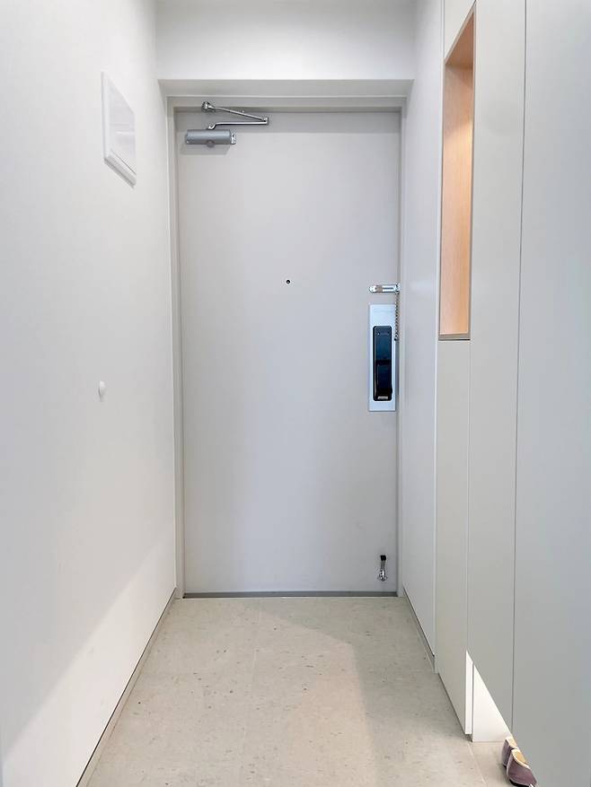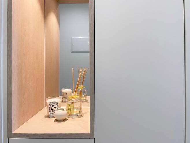 그렇지만 우리 집의 첫 인상을 좌우하는 공간이 아무 것도 없는 듯한 흰 벽만 있는 것처럼 느껴지는 것은 싫어서 중간에 작은 오픈 공간을 마련해뒀답니다. 여기에는 현관에 들어서는 순간 포근함을 느낄 수 있는 향을 맡을 수 있도록 디퓨저를 올려뒀어요.