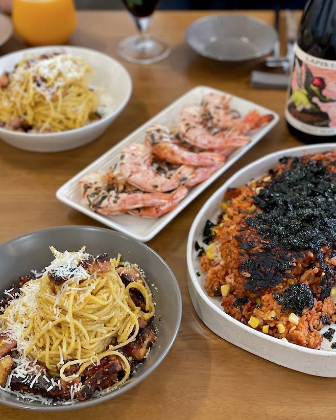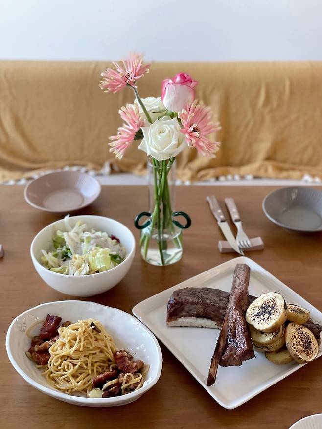 손님을 초대하는 날에는 이렇게 짝꿍의 솜씨가 테이블 위로 펼쳐집니다! 이렇게 하니 지금까지 온 친구들이나 지인분들이 예쁜 공간에서 맛있는 음식 먹으며 대접 받고 간 기분이라고 하더라고요 :▷
