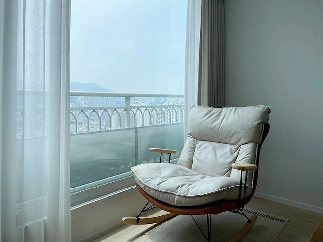 한 덩치 하는 짝꿍도 걱정 없이 몸을 기댈 수 있어 너무 좋다고 하는 의자라 정말 추천드립니다! 여기에 앉으면 탁 트인 뷰에 지나가는 비행기를 눈으로 쫓으며 멍 때리는 시간을 가질 수 있어 우리 집의 힐링 존이랍니다. 낮에도 밤에도 너무 예뻐요!