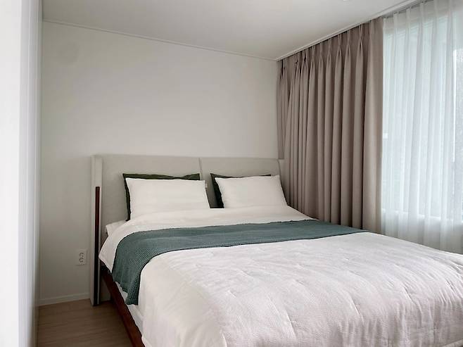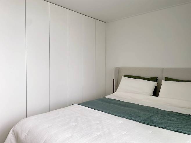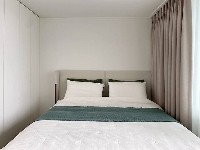 붙박이장이 방 입구 쪽에 있다 보니 침대는 더 아늑하게 안으로 들어갔어요. 제가 침실은 아늑한 휴식의 공간으로 만들고 싶다고 하니 인테리어 턴키 업체에서 창문의 규모를 줄이자고 했는데 살아보니 그 말을 따르길 잘했다는 생각이 들어요.