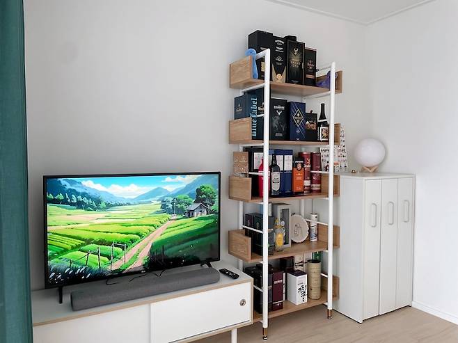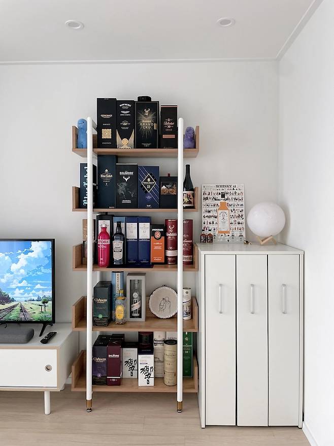 그리고 위스키에 푹 빠져 있는 짝꿍을 위해 위스키 장을 두었어요. 이미 꽉 채워져 있는 술장은 집에 오시는 분들마다 신기하게 보십니다.