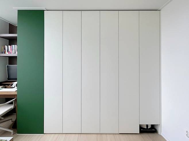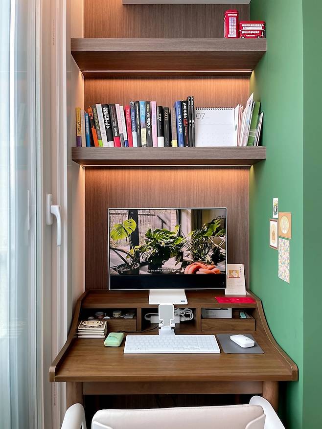 제 책상이 있는 공간은 허물 수 없는 배관과 날개벽 덕분에 숨겨진 비밀 공간 같은 모습이 되었어요. 화이트&우드 톤 인테리어에 그린을 포인트로 넣고 싶어서 날개벽 색을 그린으로 했는데, 그렇게 하니 이 공간의 짙은 우드톤과 더할나위 없이 잘 어우러지더라고요!