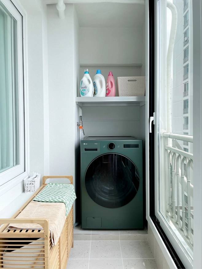 대피로를 온전히 막아버리면 안전 문제에 너무 취약할 것 같아 아쉽지만 건조기는 사지 않고 세탁기만 두었어요. 다행인 건 이 집에서 제일 먼저 사야 한다고 했던 물건이 도어스토퍼일 정도로 통풍이 매우 잘 되는 집이라 현재까지는 건조기의 부재가 거의 느껴지지 않는 것 같아요.