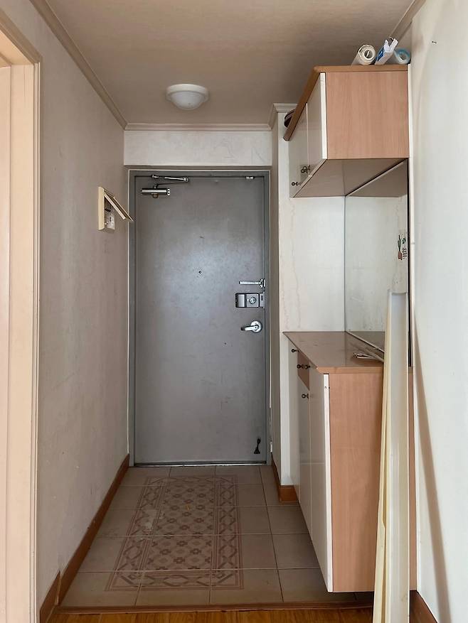 현관 역시 이 아파트가 처음 지어졌을 때 상태 그대로였어요. 작은 평수의 단점인 수납 부족이 여실히 드러나는 현관이었답니다. 그리고 집 보러 다녔을 때 같은 구조&평형의 집 중에서 현관 중문이 없는 경우 현관 밖 소음이 그대로 집 안에서 들린 것을 봤기 때문에 중문을 필수로 해야겠다고 생각했어요.