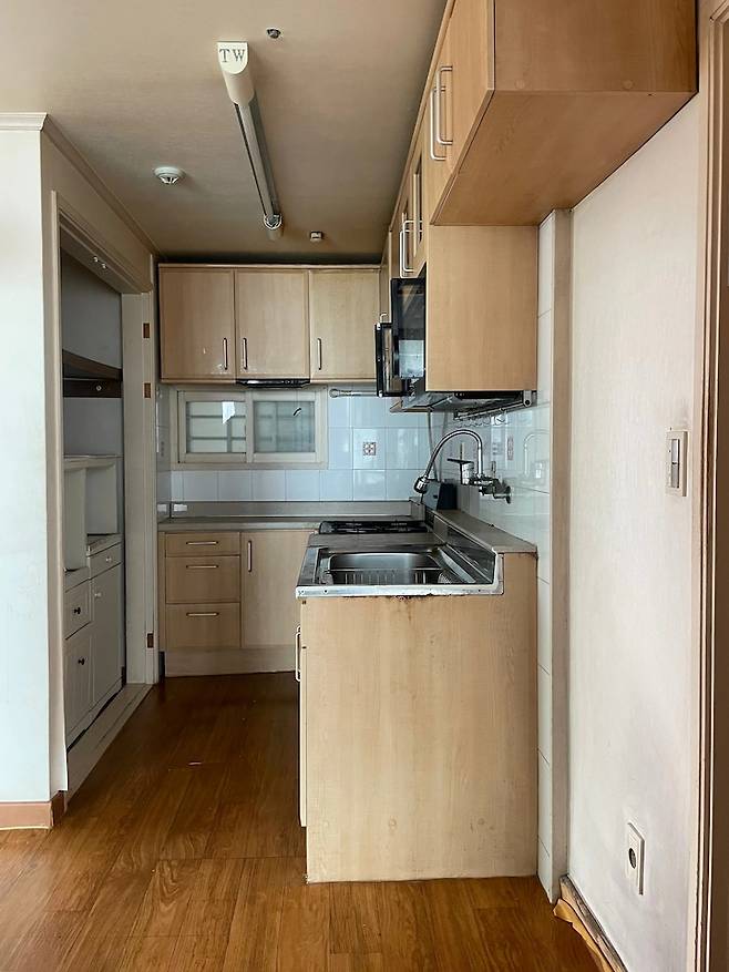 우선 주방 입구를 차지하는 덩치 큰 냉장고는 가장 안쪽으로 보내버렸습니다. 그리고 현관 밖 복도로 나 있어서 통풍에 전혀 도움이 되지 않아 사용할 수 없었던 주방의 창문은 아예 막아버리고 벽을 세웠어요.