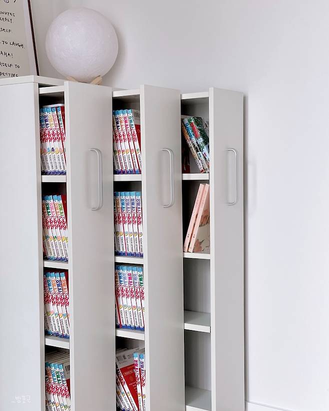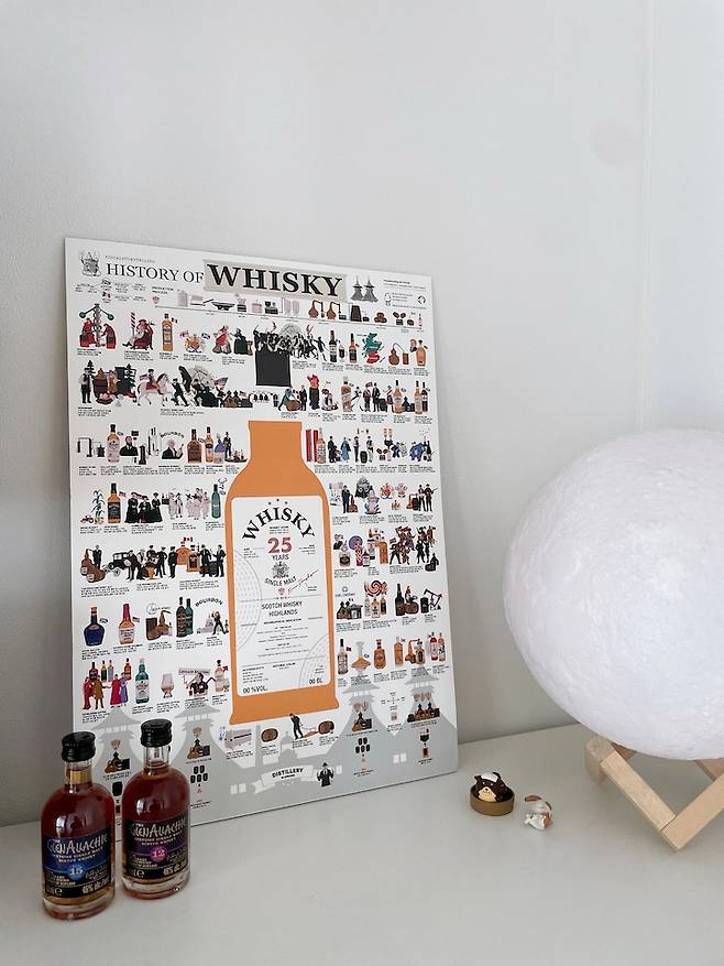 위스키장 옆으로는 최애 만화책을 절대 버릴 수 없는 저를 위한 만화 책장이 있어요. 그 위에는 최근 디자인페어 갔을 때 짝꿍에게 딱 맞는 포스터가 있어서 사온 위스키 포스터를 비롯한 몇 가지 아기자기한 소품들을 올려뒀답니다.