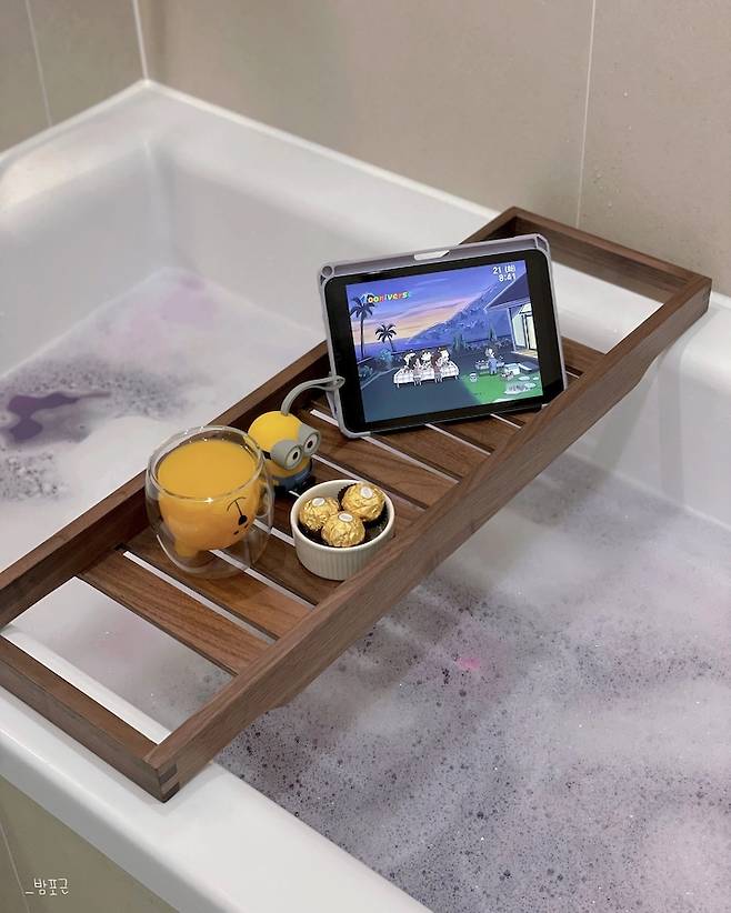 집에서는 집 다운 아늑함이 있길 바랐으니까요! 일주일에 한 번은 이렇게 욕조트레이를 올리고 입욕제를 풀어놓고 느긋한 시간을 보내며 에너지를 충전한답니다.