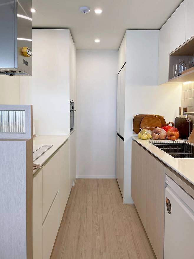 그 모습을 보니 이렇게 구조를 바꾸길 정말 잘했다는 생각이 들었어요. 이로써 조리 공간은 늘리고 답답함은 없애고 싶던 우리의 니즈를 완벽하게 반영한 주방이 되었답니다!