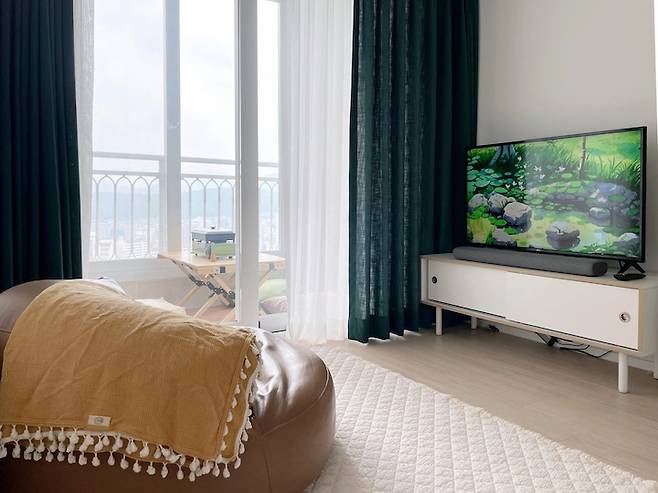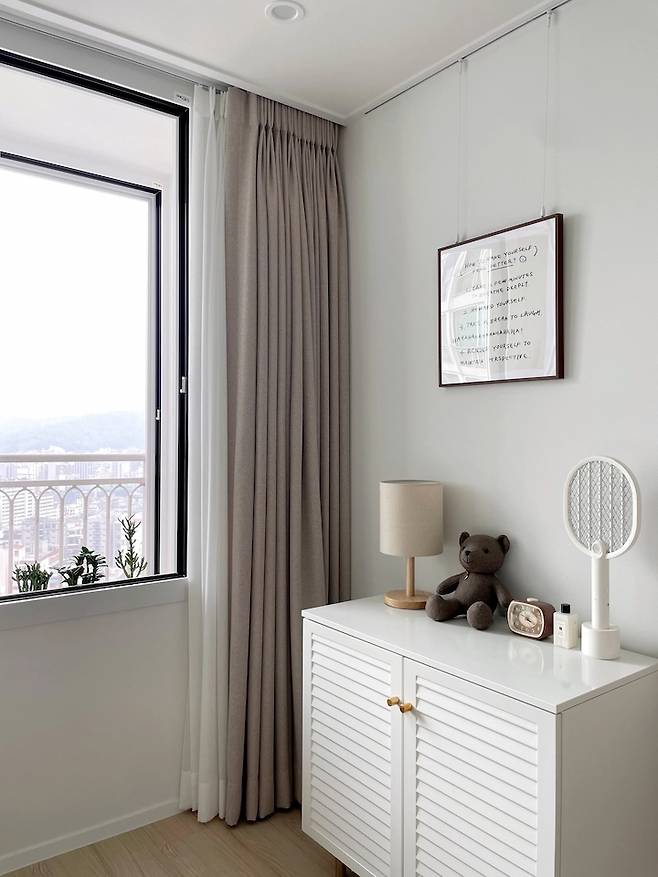 창밖 뷰가 좋은 공간이라서 처음에는 확장을 해서 평상 구조를 짜 넣자고 생각했는데 향후 아이방으로 사용할 때 인테리어를 바꿔야 하는 문제와 예산이 걸림돌이 되어 확장은 하지 않고 베란다를 활용하는 쪽으로 생각을 바꿨어요. 그리고 아이가 생기기 전까지는 우리 둘이 즐겁게 놀 수 있는 공간으로 꾸미기로 했답니다.
