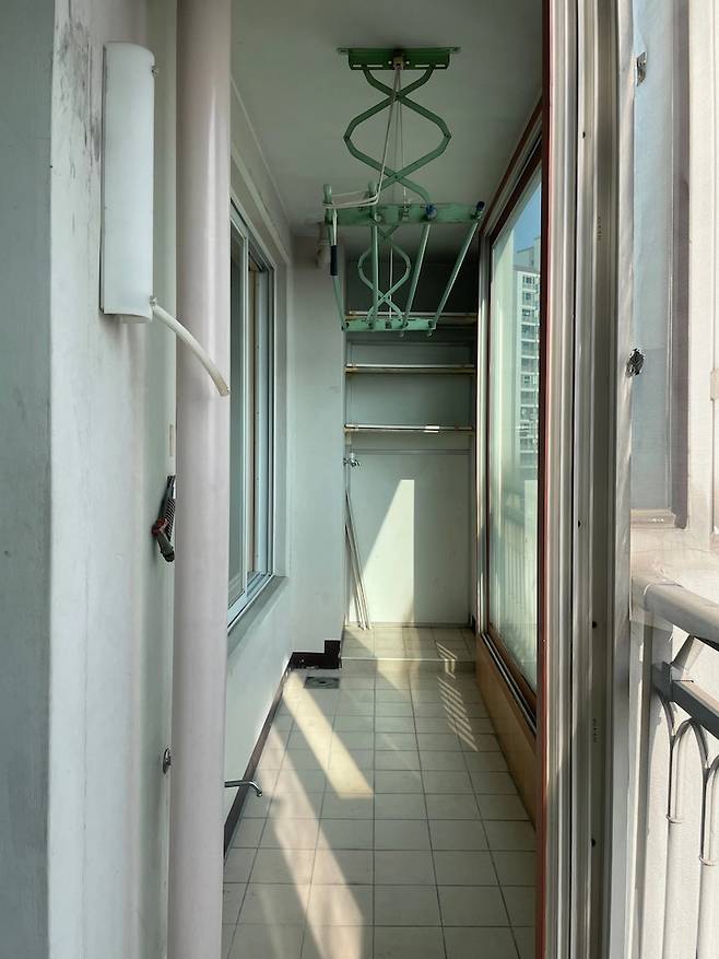 침실 옆 베란다는 리모델링 전 이런 모습이었습니다. 대피로가 있는 곳에 세탁기를 설치할 수밖에 없도록 한 이 구조가 지금도 이해가 가지 않아요 >:( 덕분에 크게 바뀔 수 없는 공간이었지만, 타일과 페인트 도색만 새로 해도 느낌이 많이 달라지는구나 느낄 수 있는 리모델링이었어요.
