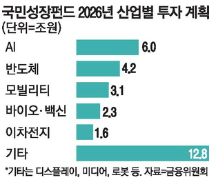 16일 기획재정부, 금융위원회 등 관계부처가 ‘2026년 국민성장펀드 운용 방안’을 발표했다. 정부는 국민성장펀드가 본격 가동되는 첫해인 내년에 자금을 30조원 이상 투입하기로 했다. 산업별 투자액은 인공지능(AI) 6조원, 반도체 4조2000억원, 모빌리티 3조1000억원, 바이오·백신 2조3200억원 등이다.