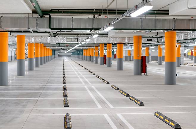 지하 주차장은 지상 주차장과 바닥 재료가 다릅니다. 지하 주차장 바닥은 아스팔트나 콘크리트가 아닌 특수한 도료로 마무리 시공을 하죠. 많이 사용되는 것이 액체형 우레탄 도료와 에폭시 페인트입니다. 이 두 재료는 방수 기능이 있고 먼지가 발생하는 것을 줄여주죠. 바닥의 마모를 최소화해 보수 주기를 늘리는 효과도 있습니다.