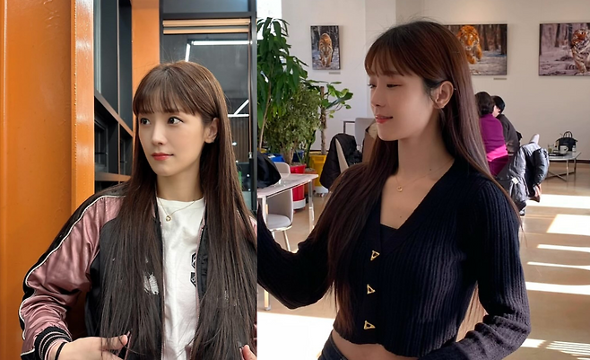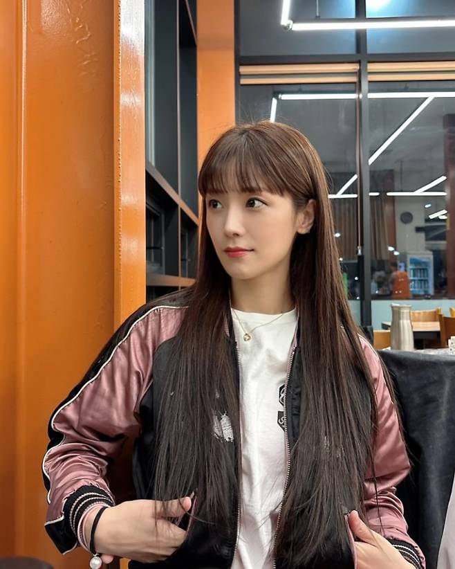 오렌지색 인테리어가 돋보이는 공간에서 소율은 핑크 컬러 배색이 특징인 블랙 봄버 재킷과 화이트 티셔츠의 조합으로 캐주얼한 스트리트 패션을 선보이고 있다. 긴 생머리와 자연스러운 메이크업, 그리고 심플한 목걸이로 포인트를 주어 편안하면서도 트렌디한 분위기를 연출하고 있다. 일상 속에서도 돋보이는 패션 감각으로 많은 팬들에게 스타일 영감을 주고 있다.
