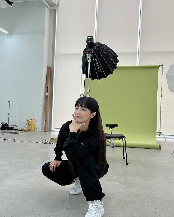 소율은 촬영 스튜디오에서 올블랙 캐주얼 룩을 선보이고 있다. 여유로운 핏의 검은색 상하의 세트를 착용하여 편안하면서도 세련된 분위기를 연출하고 있다. 특히 흰색 운동화와의 조화가 돋보이며, 긴 생머리 스타일과 앞머리가 그녀의 청순한 이미지를 한층 더 강조하고 있다. 무대 뒤 촬영 현장에서도 자연스러운 포즈와 표정으로 프로페셔널한 모습을 보여주고 있다.