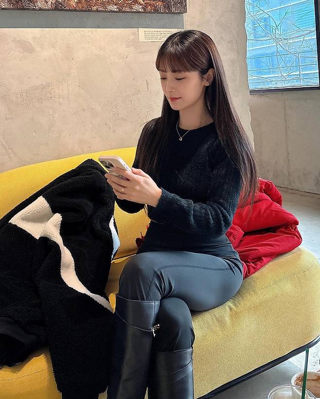 노란색 소파가 돋보이는 모던한 카페 공간에서 소율은 블랙 니트와 그레이 팬츠의 조합으로 시크한 분위기를 자아내고 있다. 심플한 목걸이로 포인트를 주었으며, 붉은색 아우터를 소파에 걸쳐두어 컬러 대비를 이루고 있다. 스마트폰을 확인하는 일상적인 모습에서도 세련된 패션 감각이 돋보인다.