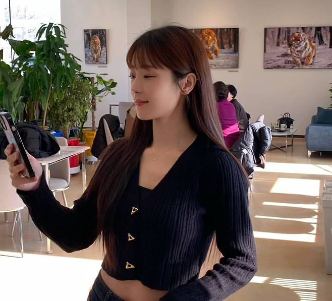 밝은 실내 공간에서 소율은 골드 버튼 장식이 돋보이는 블랙 니트 카디건을 착용하고 있다. 슬림한 실루엣의 카디건은 그녀의 우아한 분위기를 한층 더 강조하고 있으며, 심플한 목걸이와 함께 세련된 미니멀 스타일을 완성하고 있다. 자연광이 비치는 공간에서 그녀의 패션 센스가 더욱 빛나고 있다.