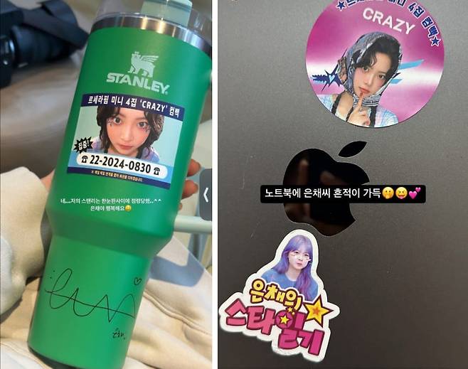해당 게시물에는 르세라핌 스텝이 인스타 스토리에 올린 사진이 게제되었는데요. 사진은 스텝의 물건인 스텐리에 홍은채가 신곡을 홍보하기 위한 스티커와 더불어 싸인이 그려져 있었습니다.