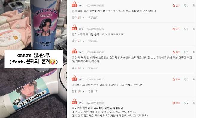이에 누리꾼들은 "사람마다 다르겠지만 홍은채랑은 별개로 난 내물건에 나 안 볼때 맘대고 뭐 적어 놓거나 붙여놓으면 좀 엥스럽긴 할듯 ", "저렇게 선물을 해준게 아니고 그냔 스텝 텀블러에다가 홍보물 붙이고 싸인하고 간거구나...", "스티커는 떼면 된다지만 싸인은 지워지려나", "지가 뭐라도 되는 줄 아나봄ㅠㅠ 감히 스탠리에 니가 뭔데ㅠㅠ" "스텝들 이거 일부러 올린거 같네ㅋㅋㅋㅋ대놓고 뭐라할 수는 없으니" 등과 같은 반응을 보였습니다.