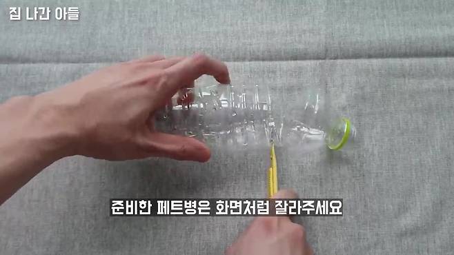 칼이나 가위를 사용해서 병의 아래쪽을 잘라 낸 뒤, 끝 부분을 깔끔하게 다듬습니다.