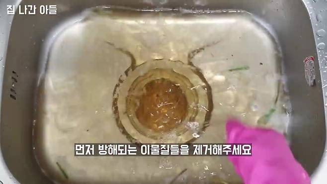 고무장갑을 끼고 배수구 주변 이물질을 제거해 주세요.
