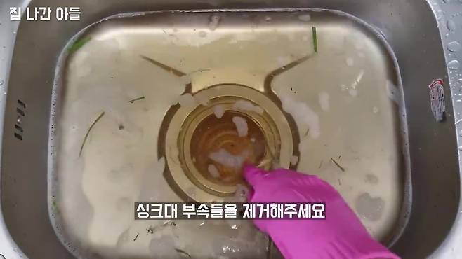 싱크대 부속품을 분리해 배수관이 보이게끔 정리합니다.