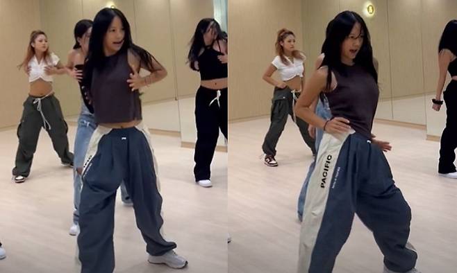 이효리는 편안한 민소매 탑과 트레이닝 바지를 입고 춤 연습에 몰두하고 있다.