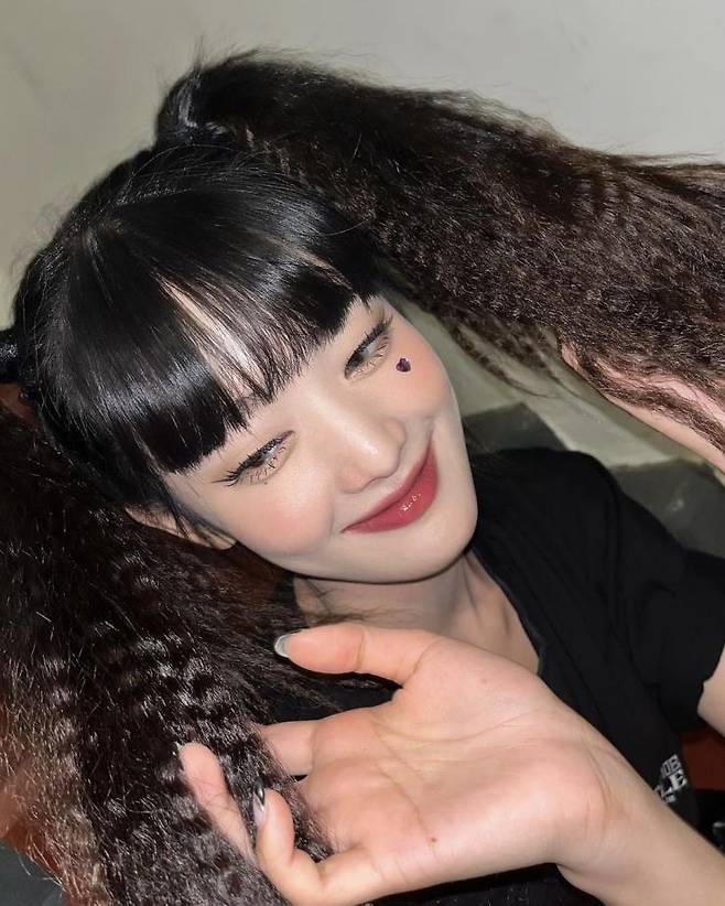 양갈래 머리에 귀여운 하트 파츠를 붙인 민니. 사랑스러운 악동 할리퀸을 연상케 하는 메이크업입니다.