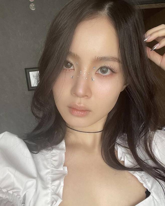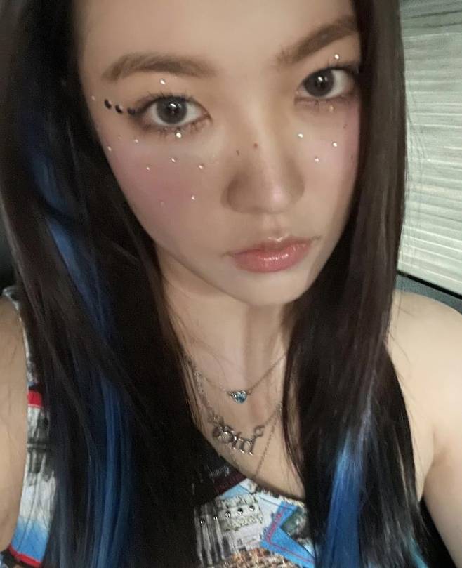 큐빅을 활용해 힙한 메이크업을 완성한 예리. 자잘한 큐빅들이 눈가에 붙으니 오묘한 느낌이 나네요. 립은 글로스로 투명하게 마무리한 것도 힙한 큐빅 메이크업 포인트!