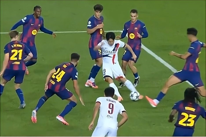 대신 이강인은 커리어에 남을 '인생 사진'을 건졌다. 바르셀로나 페널티지역 안에서 무려 7명의 바르셀로나 선수들이 자신을 막기 위해 인근 공간을 둘러싼 장면이 중계화면에 그대로 담긴 것이다. 이강인이 돌파 이후 슈팅까지 시도했으나 공이 골대를 강타하며 찬스가 무산된 그 상황이었다.