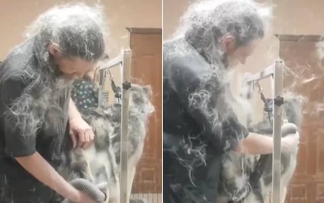 미용사는 잠시후 시베리안 허스키 강아지의 털을 미용하기 시작했는데요. 시간이 얼마나 흘렀을까. 미용사의 온몸에 털이 뒤범벅돼 보는 이들을 놀라게 합니다.