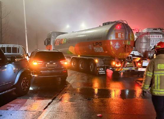 [14일 오전 5시 15분께 경기 고양시 일산서구 자유로 구산IC 파주 방향 인근에서 발생한 차량 44대 연쇄 추돌 사고로 트럭과 버스, 승용차 등이 뒤엉켜 있다. (경기도북부소방재난본부 제공=연합뉴스)]
