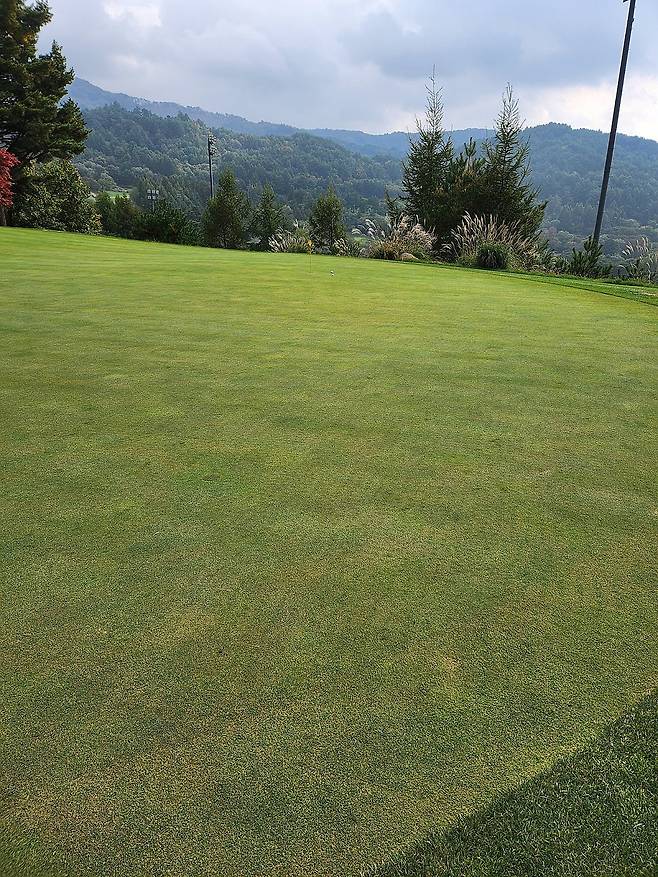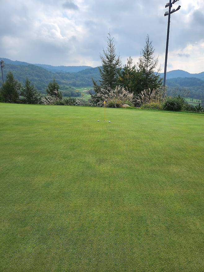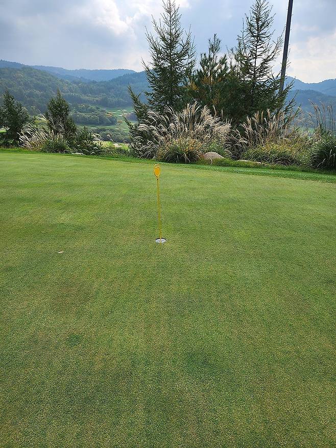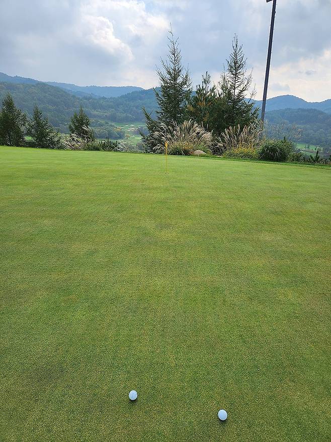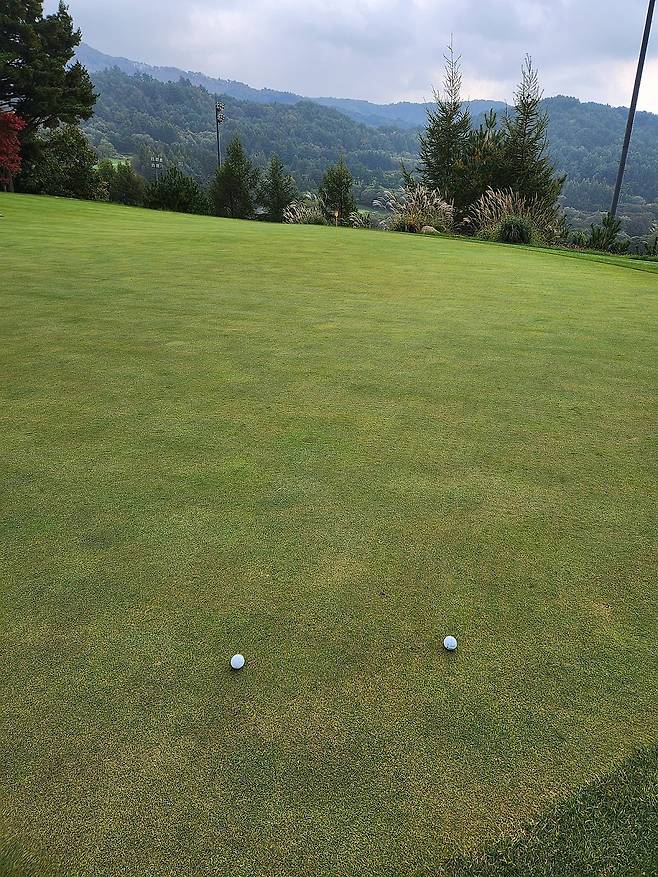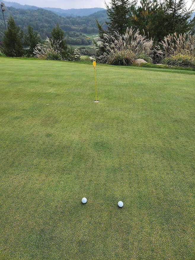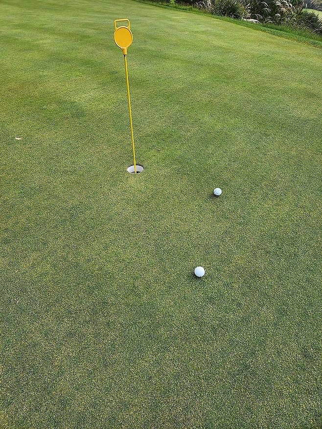연습 그린 끝에서 끝까지 퍼팅입니다. 온을 온이라 부르기 힘든 미스샷이며 제발 올라가 있지 마라를 100번 외치면서 그린으로 걸어가지만 이내 강력한 실망감에 보기로 막자는 마음만 굳게 먹는 거리입니다. 사진에서 잘 표현되지 않지만 왼쪽에서 오른쪽으로 흐르는 큰 경사가 있지만 중간 부분에서 우측 마운드의 영향을 받는 어려운 펏입니다. 제발 붙여서 3펏 이내로 끝내자는 생각만 간절하게 하고 스트로크 하였는데 결과가 상당히 좋네요. 방향도 우측에 동일하게 떨어지니 방향에 대한 일관성도 좋아 보입니다. 역시 퍼팅은 자신감입니다.