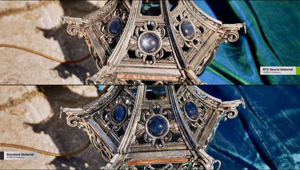 RTX Neural Materials는 AI를 사용하여 도자기와 실크 같은 여러 층으로 구성된 복잡한 셰이더 코드를 압축, 최대 5배 빠른 소재 처리 속도를 통해 고품질 에셋을 렌더링할 수 있습니다.