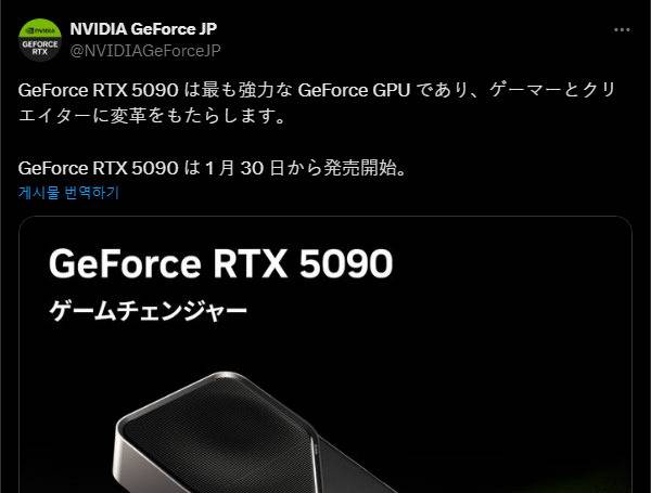 엔비디아 지포스 일본 X 계정에 따르면 RTX 5090은 1월 30일 출시될 예정이며, 기존 루머에 따르면 RTX 5080은 1월 26일 출시 예정이라 각 제품간 출시 간격이 채 일주일이 되지 않는다.