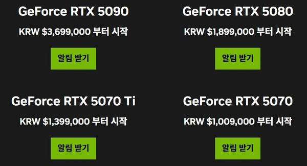 한편, CES에서의 공식 발표 이후 엔비디아 홈페이지에 공개된 국내 원화 가격은 RTX 5090이 약 370만원, RTX 5080 약 190만원, RTX 5070 Ti 약 140만원, RTX 5070 약 101만원으로 표기되어 논란이 일었다.