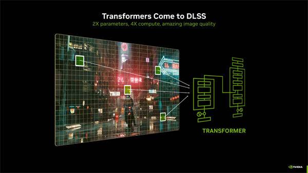엔비디아는 지금까지의 DLSS에 적용되어온 CNN(Convolutional Neural Networks)이 한게에 달했다며, 새로운 DLSS 트랜스포머 모델을 사용해 전체 프레임과 여러 프레임에서 각 픽셀의 상대적 중요성을 평가, CNN 모델의 매개변수를 두 배로 늘려 안정성과 고스팅, 디테일, 알리아싱을 개선한다.