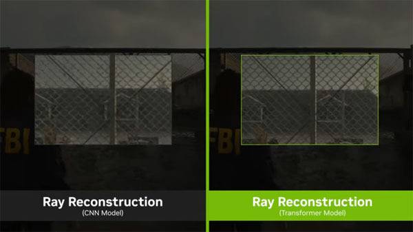 엔비디아는 집중적인 레이 트레이싱 콘텐츠에서 Ray Reconstruction을 위한 새로운 트랜스포머 모델은 특히 조명 조건이 까다로운 장면에서 이미지 품질을 크게 향상시킨다며, 체인링크 펜스의 안정성 증가, 회전하는 선풍기 날개의 고스팅 감소 등을 이뤄내 게이머의 몰입감을 높일 수 있다고 소개했다.