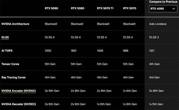 RTX 5070은 인코더와 디코더가 각 1개씩, RTX 5070 Ti는 2개의 인코더와 1개의 디코더, RTX 5080은 2개의 인코더와 2개의 디코어, RTX 5090은 3개의 인코더와 2개의 디코더가 탑재된다.