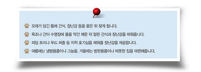 이러한 이유들로 따져봤을 때 땅 파기를 문제 행동이라고 보기는 어렵습니다. 다만 반려견이 땅 파는 행동을 반복해 장판이 벗겨지거나 담요, 이불 등이 찢어지는 일이 자주 발생하면 보호자는 불편함을 호소하게 되죠. 이때 반려견의 땅 파기 욕구를 대신 충족해줄 방법은 다음과 같습니다.