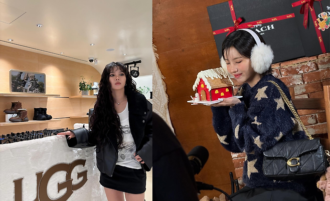 밤하늘을 연상시키는 네이비 컬러의 니트에 큼지막한 별 패턴이 수놓아져 있어 낭만적인 겨울 분위기를 자아낸다. 복슬복슬한 앙고라 소재의 질감은 보는 것만으로도 따스함을 전달하며, 귀를 덮는 하얀색 퍼 귀마개를 착용해 러블리한 매력을 한껏 강조했다. 어깨에 멘 퀼팅 디테일의 블랙 체인 백은 골드 장식이 더해져 고급스러운 포인트가 되었으며, 전체적으로 포근하면서도 페미닌한 겨울 소녀의 이미지를 완성했다.