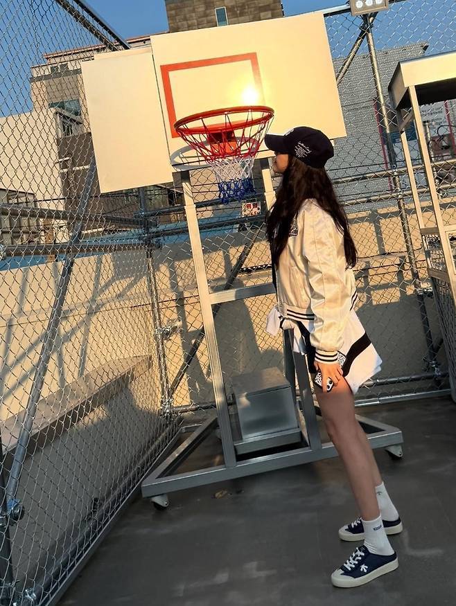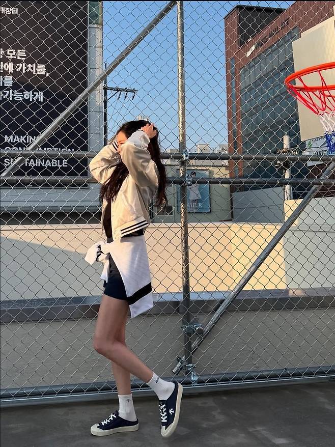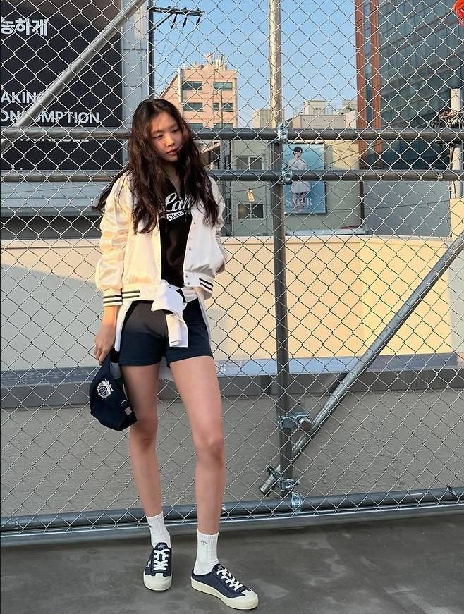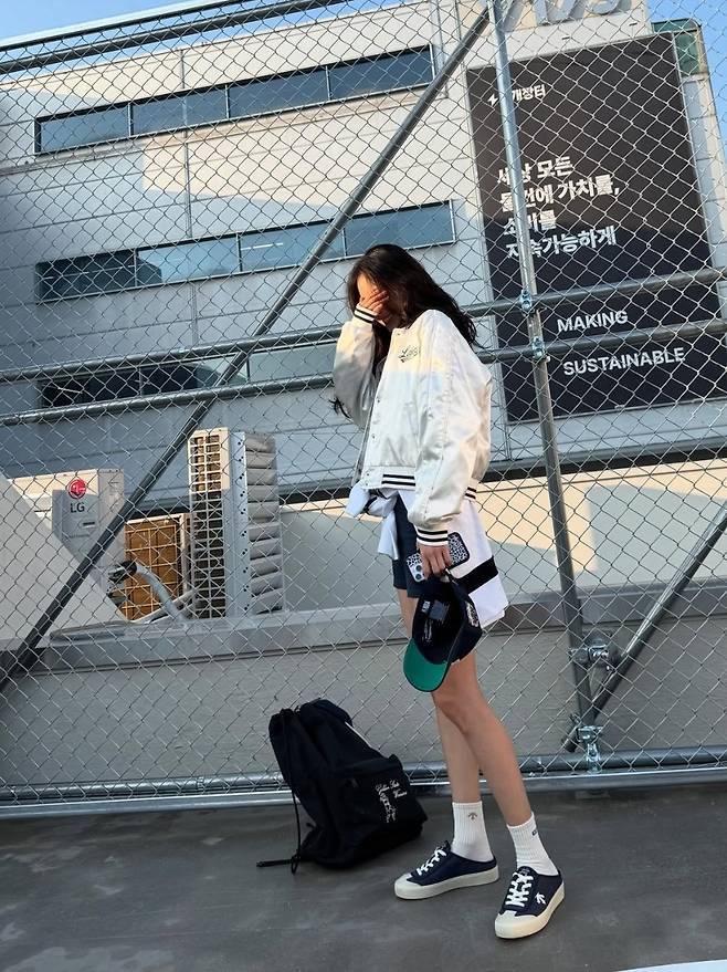 손나은은 화이트 바시티 재킷에 블랙 쇼츠를 매치하며 하이틴 감성을 한껏 살린 데일리룩을 선보였습니다.